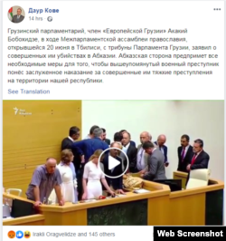 აფხაზეთის დე ფაქტო რუსპუბლიკის საგარეო საქმეთა მინისტრი დაურ კოვე სოციალურ ქსელ ფეისბუკში გამოეხმაურა 20 ივნისს, თბილისში, მართლმადიდებლობის საპარლამენტთაშორისო ასამბლეის სესიის მიმდინარეობისას მომხდარ ინციდენტს, რომლის დროსაც „ევროპული საქართველოს“ წევრმა, აკაკი ბობოხიძემ რუსეთის დელეგაციის წევრების გასაგონად თქვა, „ვხოცავდი თქვენიანებს, ვხოცავდი აფხაზეთში, ვხოცავდი და დავხოცავ“.