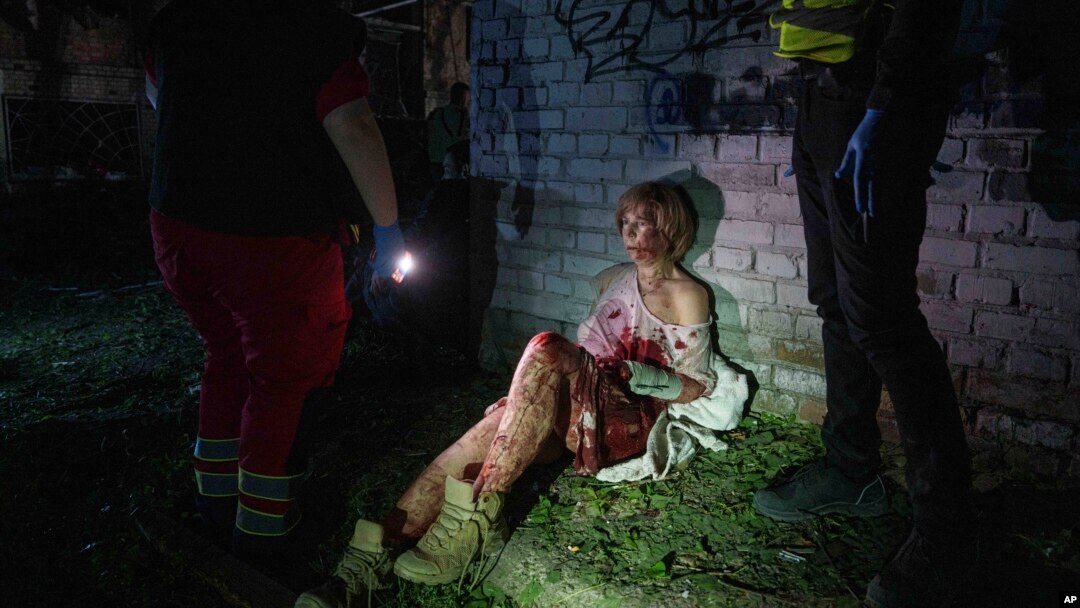 უკრაინელ სამხედროს გადაჰყავს დაშავებული ქალი, რომელიც სახლის ნანგრევებიდან ამოიყვანეს რუსეთის საჰაერო თავდასხმის შემდეგ, კიევის საცხოვრებელ უბანში. 24 აპრილი, 2025.